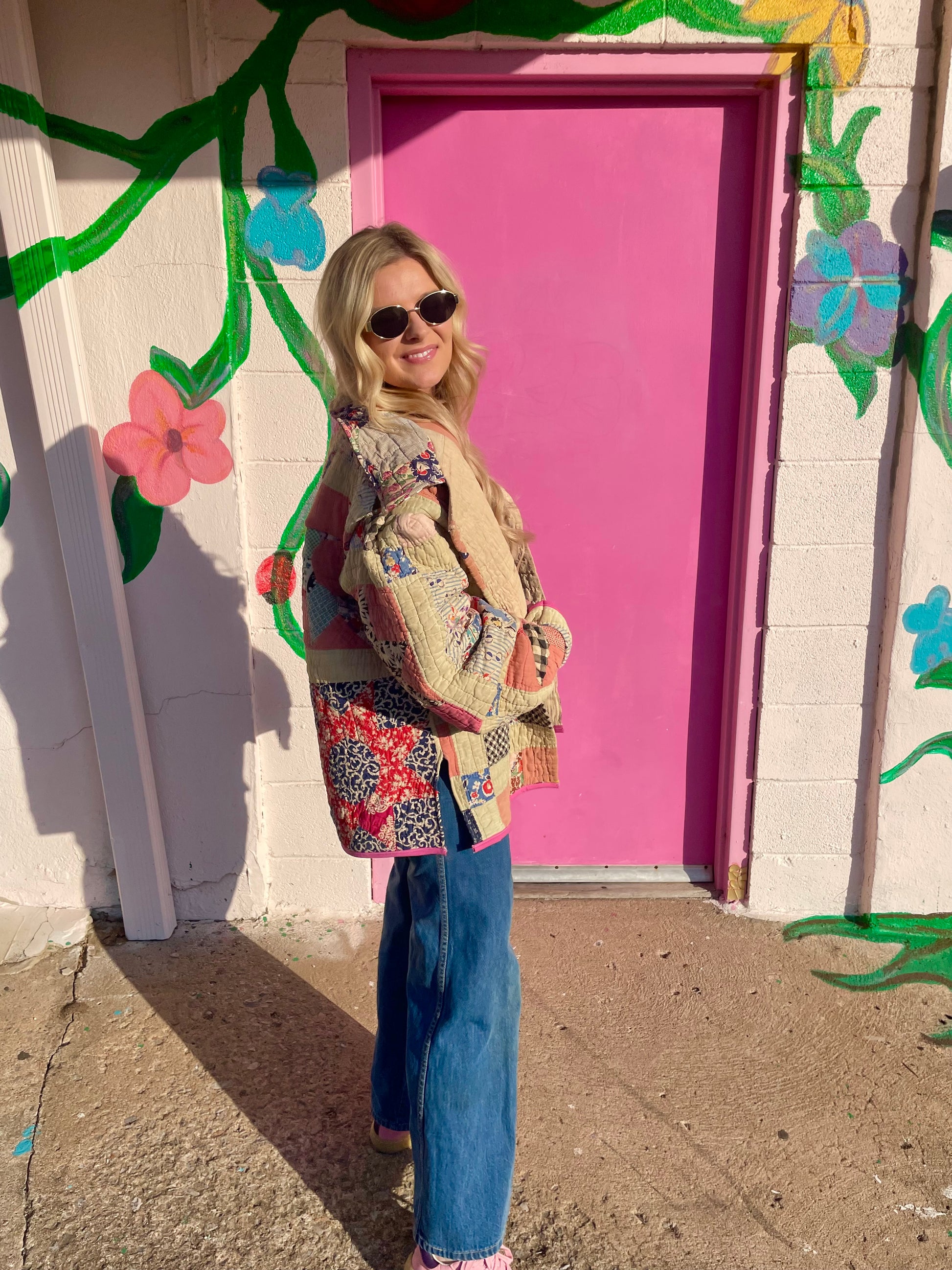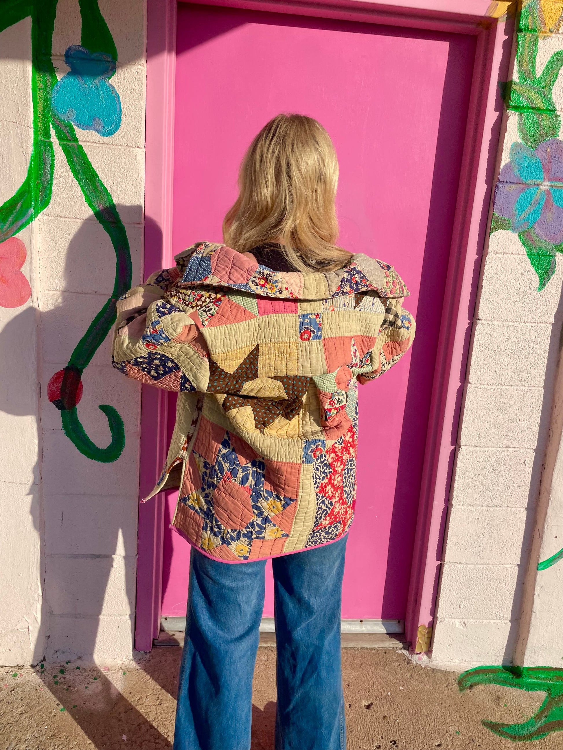 - The jacket is made out of a VERY OLD vintage quilt, so there will be imperfections within the jacket/fabric & some slight coloration.